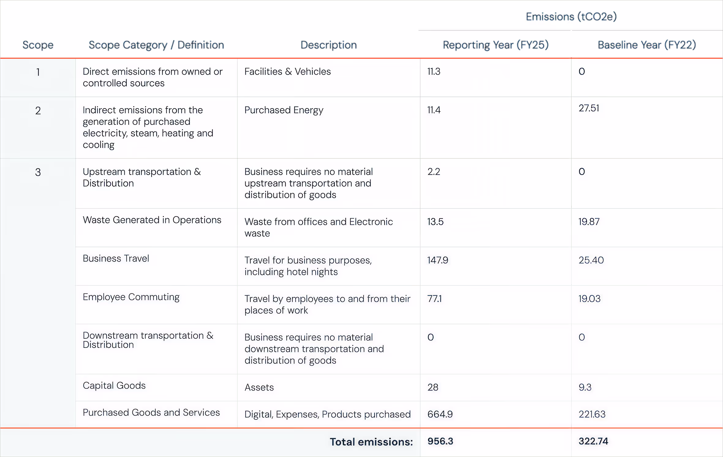 Baseline emissions are a record of the GHGs that have been produced in the past and were produced prior to the introduction of any strategies to reduce emissions. Baseline emissions are the reference point against which emissions reduction can be measured. The reporting year is the financial year 2025 and the baseline year is the financial year 2022.